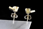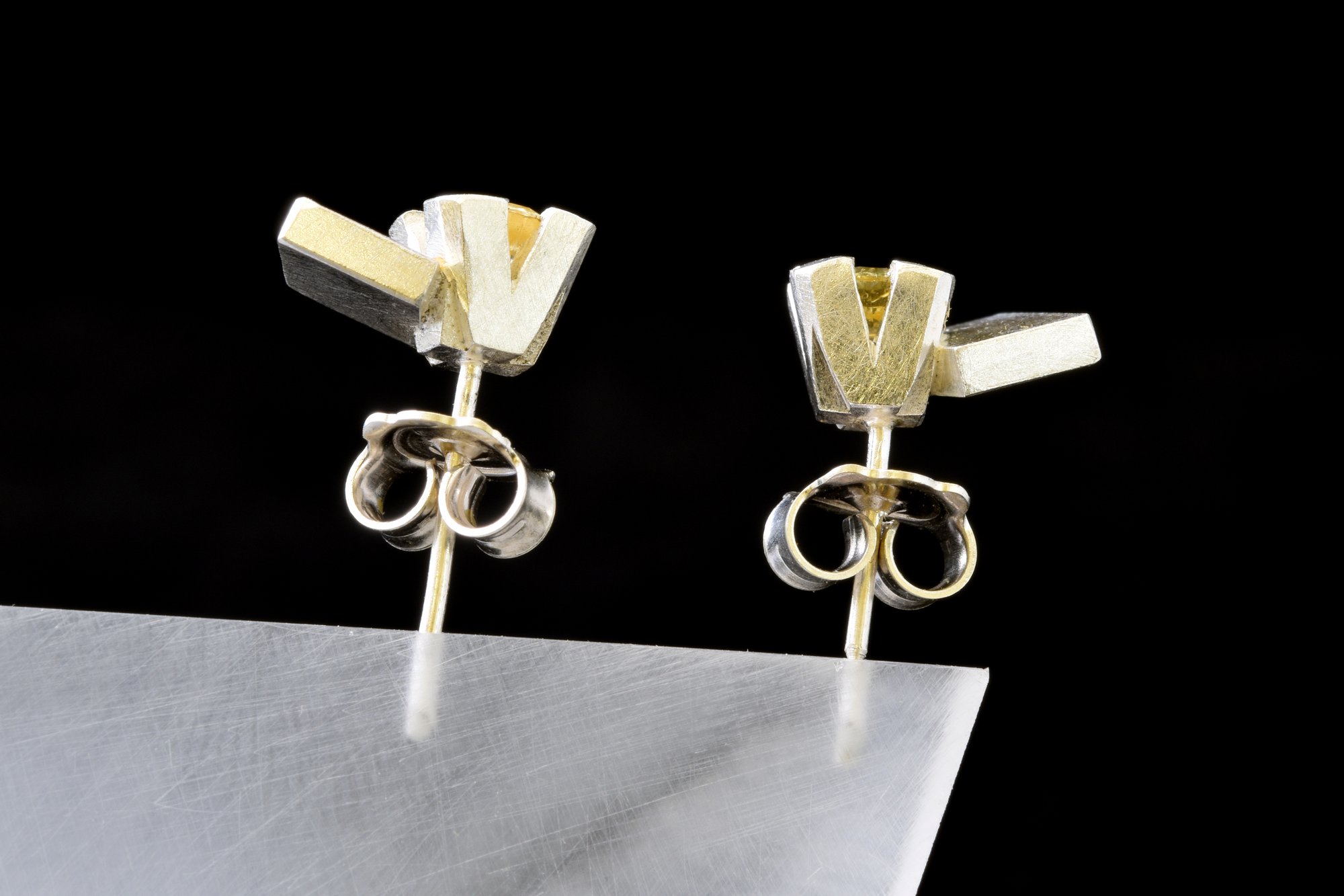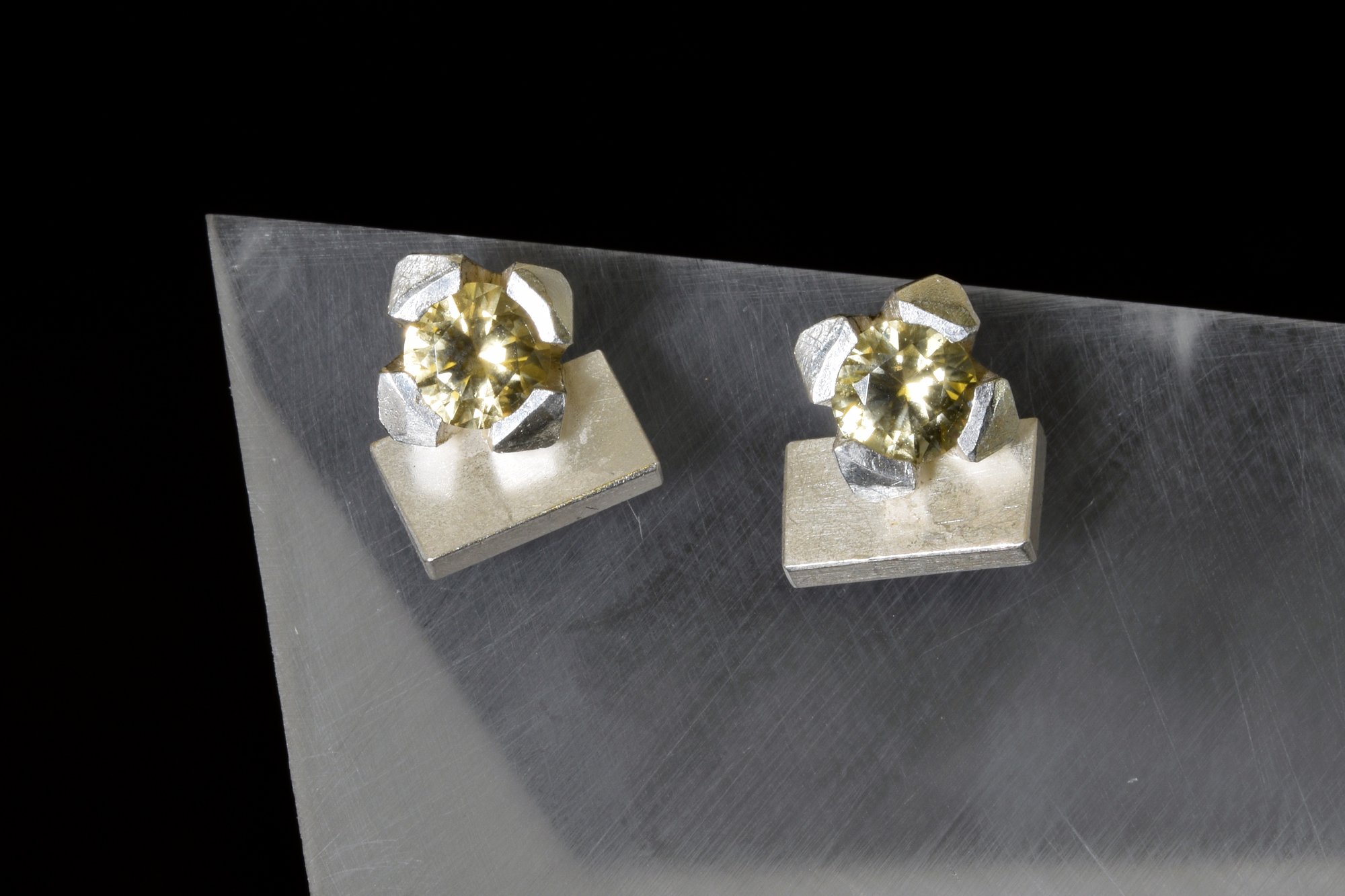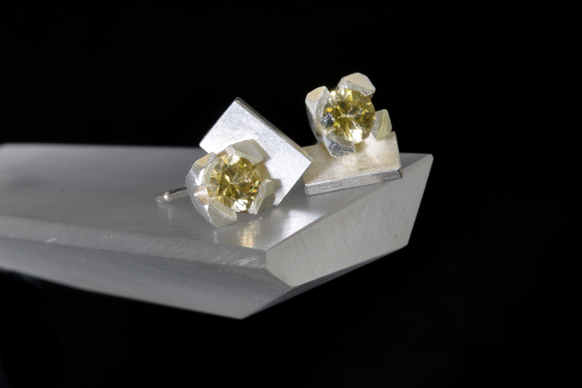 yellow-green zircon set in a contemporary 4 claw silver setting with cubic 'leaf'