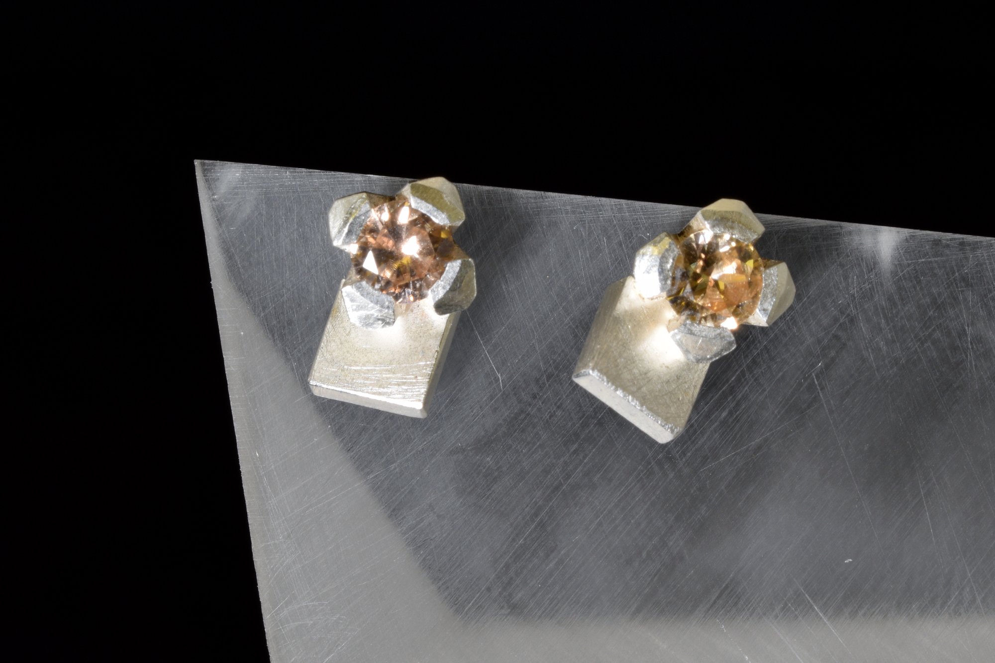 yellow-green zircon set in a contemporary 4 claw silver setting with cubic 'leaf'