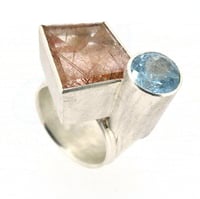 Large Silver Strata ring with freeform mirror cut rutilated quartz and a round aquamarine.